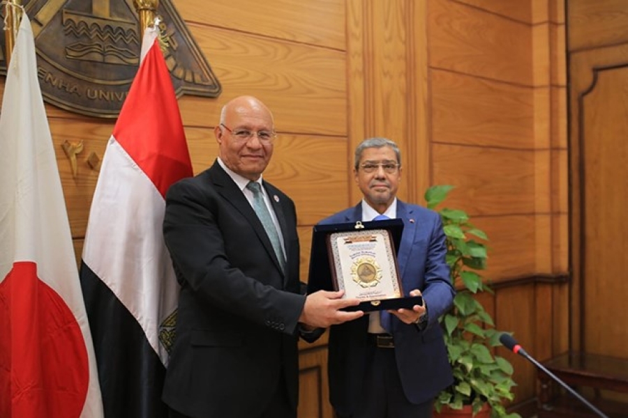 Dr.Gamal Sosa, Benha University President honored Eng.Ibrahim El Araby ; the Chairman of the Board of Directors of Elaraby Group , President of the General Federation of Chambers of Commerce and the Chairman of the Egyptian-Japanese Business Council after receiving the Order of the Rising Sun from the Japanese Emperor. The meeting was held in presence of Oka Hiroshi, the Japanese ambassador in Cairo, , Tsukazaki Daisuke, the cultural advisor at the Japanese Embassy in Cairo , Prof.Dr.Nasser El Gizawy, Benha University Vice-president for Post Graduate Studies and Scientific Research, Dr. Tamer Samir, Vice President for Education and Student Affairs and deans of the following faculties ; Science Applied Arts , Agriculture , Medicine , Nursing , Engineering and Computer and Artificial Intelligence , Dr.Mahran El Nagar , Director of the International Relations Office at the university and Dr. Ayman Samir , the Japanese Relations Coordinator at the University. For his part, Dr.Gamal Sosa said that Eng. Ibrahim El-Araby is one of the honorable Egyptian models. He also praised the El-Araby groups as one of the national companies supporting the Egyptian industry. He also added that within the framework of cooperation and communication with businessmen and industry in Qalyubia governorate, Benha University organized the first community meeting to discuss the challenges facing industry in Qalyubia governorate and the proposed solutions, stressing that the University was keen to organize this forum to achieve real communication with the industrial community ,to take serious ,real steps towards a solution , solving its existing problems and to contribute to the development of its production with practical and innovative solutions . For his part, Eng. Ibrahim El-Araby expressed his happiness with honoring of Benha University, pointing out that El-Araby Group is keen to communicate with the University and benefit from its research and scientific centers to serve the industry, praising Benha University graduates in various departments that serve the industry sector. Eng. Ibrahim El-Araby indicated that the El-Araby Group since its inception has been keen to strengthen ways of cooperation with the Japanese side and to sign a set of agreements to serve the industry. It is worth mentioning that the Order of the Rising Sun is a high-level award that granted by the Emperor of Japan to non-Japanese people who have achieved outstanding achievements within Japan and the international community, in appreciation of his efforts to support economic and trade relations between Egypt and Japan and to increase trade exchange between the two countries.